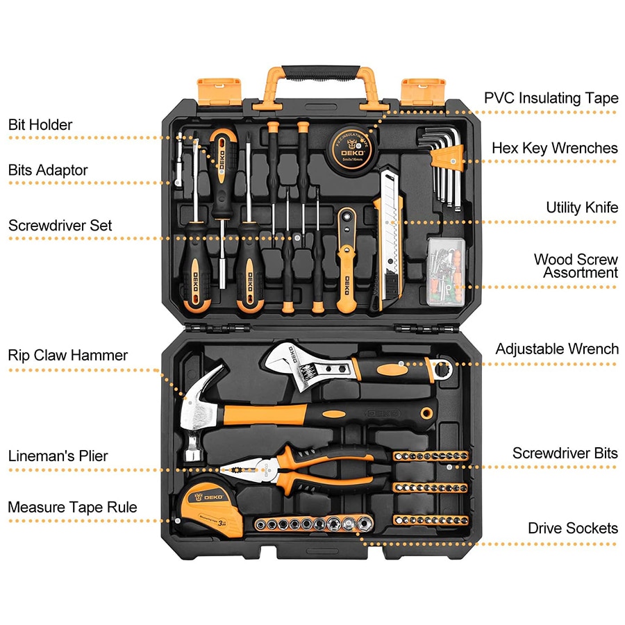 DEKO 100Pcs/113Pcs EDC General Household Repair Hand Tool Set with Tool box Socket Wrench Screwdriver Knife for Woodworking